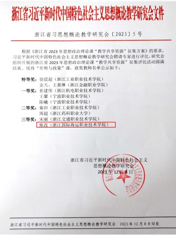 12月8日,由浙江省习近平新时代中国特色社会主义思想概论教学研究会组织开展的浙江省2023年思想政治理论课“教学共享资源征集”评比活动揭晓,我校马克思主义学院戴智明老师获得《思想道德与法治》课“教学共享资源征集”一等奖,熊孜老师获得《形势与政策》课“教学共享资源征集”三等奖。