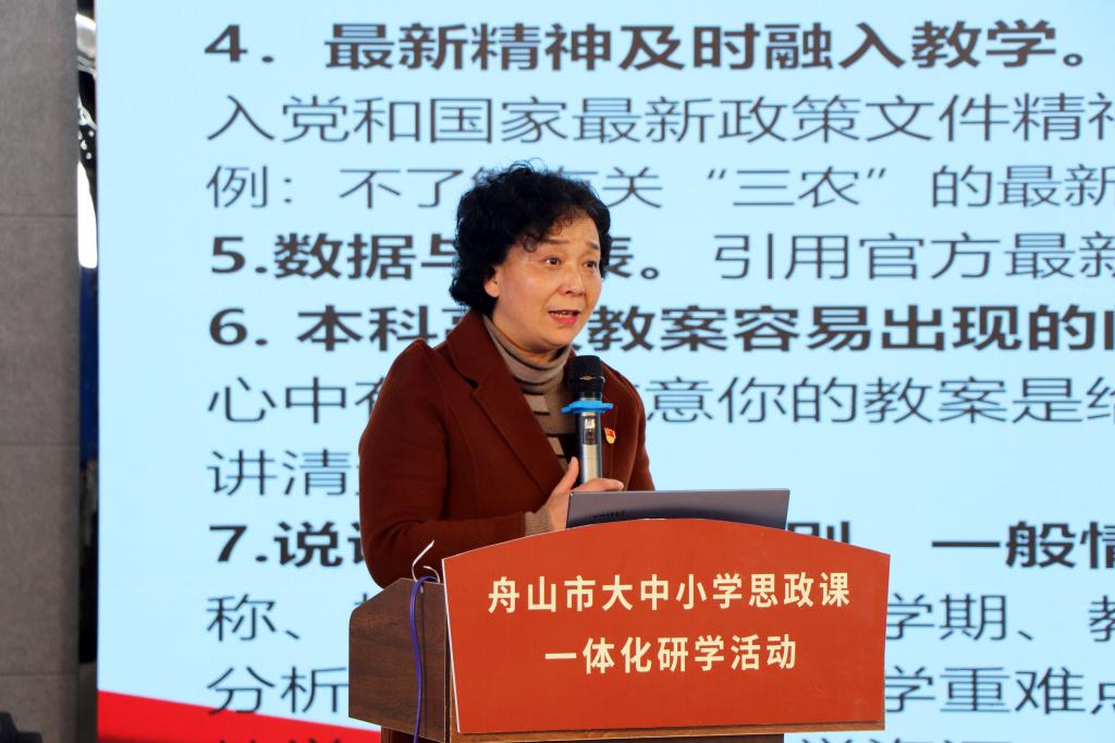 主旨宣讲阶段,应邀赴会的全国高校思政名师工作室负责人、2022年浙江省首届教书育人楷模、浙江省黄炎培职业教育奖杰出教师奖获得者,两次获得教育部思政课教学展示类最高奖项的浙江农业商贸职业学院马克思主义学院院长丁菁教授作了题为《六大协同推进大中小思政课一体化建设》的专题讲座,她从教材协同、教学协同、教研协同、资源协同、科研协同、实践协同等六个方面为提升大中小学思政课一体化建设水平厘清了思路、提供了更多的路径与方法,让大家豁然开朗,凝聚了与会者共识。同时,她对舟山大中小学思政课一体化建设能够立足海岛实际、同心同德、脚踏实地推进各岛各校协同合作一体化步伐,给予了高度肯定和评价。