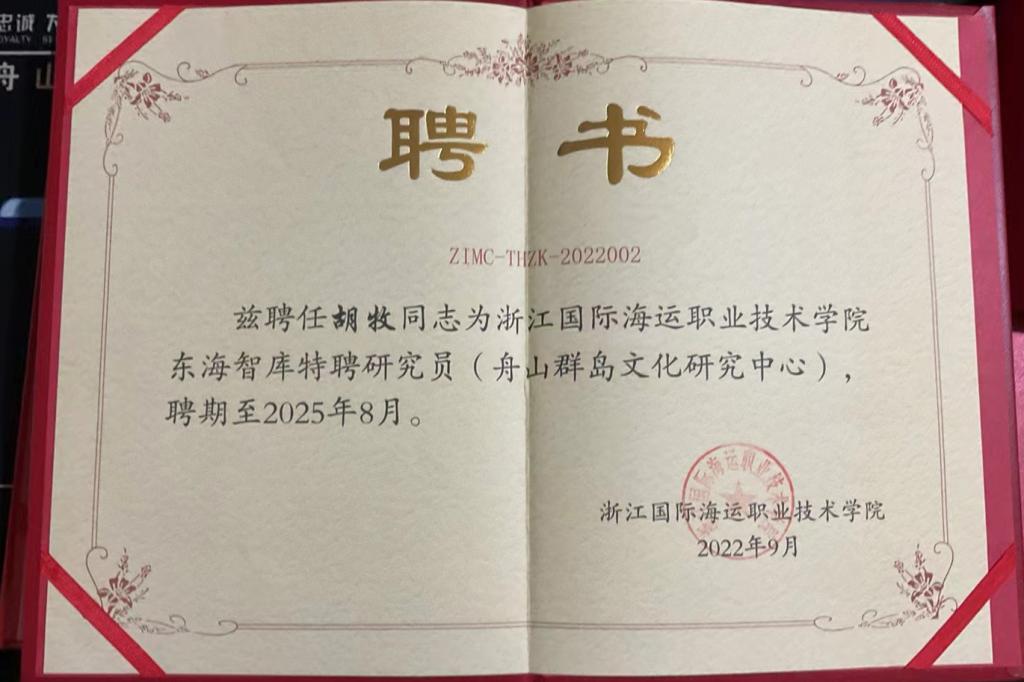 胡牧,男,1957年10月出生于沈家门渔港边的小镇,毕业于沈家门中学,高中学历,普陀区朱家尖街道退休职工。基于胡牧先生终身学习理念,对海洋文化、“里斯本丸”号沉船事件的研究,2022年9月聘任为学校东海智库特聘研究员。