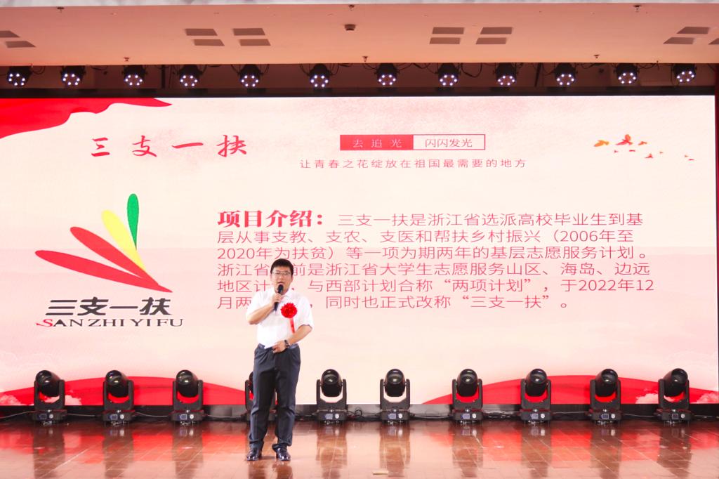 会上,李豪、俞坤、王苏菲同学进行了青春宣讲,他们分别和同学们分享了自己参加浙江省“三支一扶”志愿者、参加科技创新竞赛以及参加第二十五期省新世纪人才学院的经历。