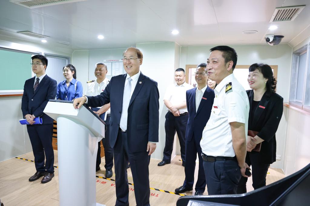 林基泽先生此行来舟山参加由浙江大学承办的“第六届长江经济带研究与创新联盟国际学术会议”,在了解到我校的航海教育和办学特色后,受邀来我校访问。林基泽先生参观了我校航海操纵模拟器、国家级航海虚拟仿真中心、轮机模拟器、邮轮实训室等教学实训场所。