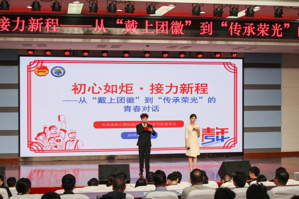 活动在《一路都是歌》的激昂演唱中拉开序幕。在新团员入团宣誓仪式环节,校团委沈楷雯宣读新团员名单,校院二级团委老师为新团员代表佩戴团徽,在领誓人校团委副书记余娜娜的带领下,全体新团员在团旗前庄严宣誓。