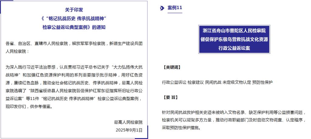 日前,最高人民检察院印发《“铭记抗战历史 传承抗战精神”检察公益诉讼典型案例》,以推动全社会铭记抗战历史、传承抗战精神。浙江省舟山市普陀区人民检察院督促保护东极岛营救抗战文化资源行政公益诉讼案,列入典型案例。