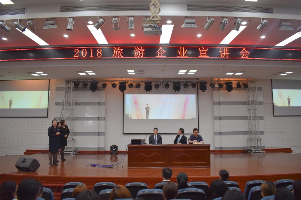与恳谈会同步进行的企业宣讲在图书馆四楼报告厅举行,到校的40家企业代表为2016级国际邮轮乘务管理和领队方向的学生作介绍,帮助广大同学了解企业,为下午即将参加的双向选择会作积极准备。