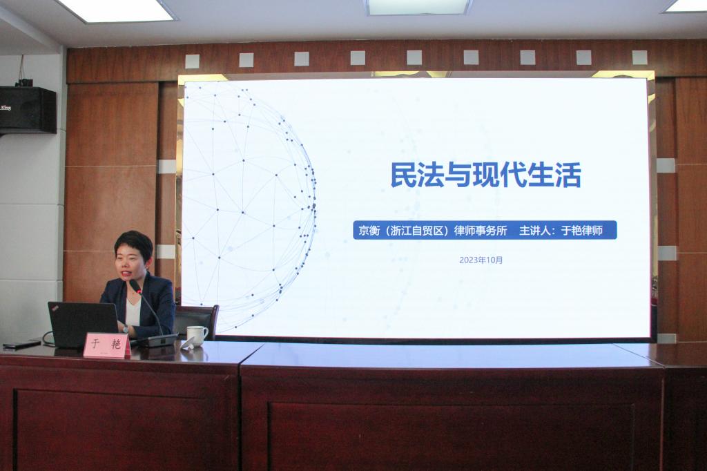 浙江京衡(浙江自贸区)律师事务所律师于艳应邀为大家讲授《民法与现代生活》专题讲座。2020年5月28日,十三届全国人民代表大会三次会议审议通过了新中国历史上首部民法典。民法典的颁布对于完善中国特色社会主义法治体系,推进国家治理体系和治理能力现代化,推进全面依法治国,切实维护好最广大人民的根本利益,促进社会公平正义具有重要意义。