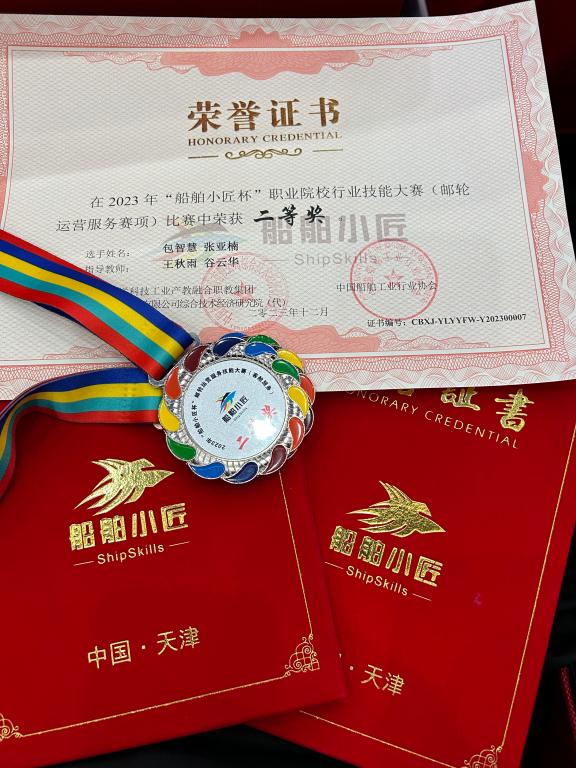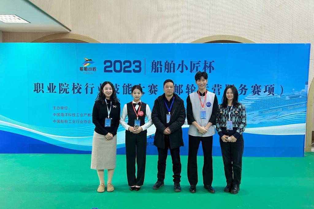 12月1日-3日,2023年“船舶小匠杯”职业院校行业技能大赛(邮轮运营服务赛项)在天津海运职业学院顺利举行,来自全国17所院校的34名选手同台竞技。海洋旅游学院院长俞海平以及专业教师王秋雨、谷云华,带领2023级国际邮轮乘务管理专业的包智慧、张亚楠两位选手,经过激烈角逐,最终荣获全国第三名,团体二等奖。指导教师王秋雨、谷云华荣获“优秀指导教师”奖。