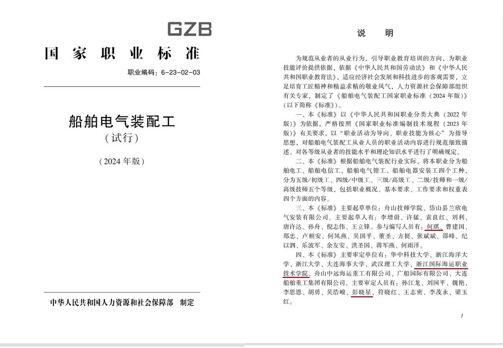 近日,人力资源和社会保障部办公厅颁布了21个国家职业标准,我校海洋装备工程学院何琪教授参与的《船舶电气装配工》(职业编码:6-23-02-03)正式颁布试行。