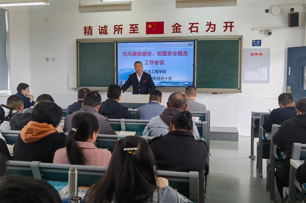 为认真贯彻落实学校2024年全面从严治党暨党风廉政建设、“清廉海运”建设及校园安全稳定工作会议精神,4月10日下午,航海工程学院在海慧楼215教室召开了党风廉政建设及校园安全稳定工作专题学习会,学院全体教职工参加,会议由党总支副书记李军主持。