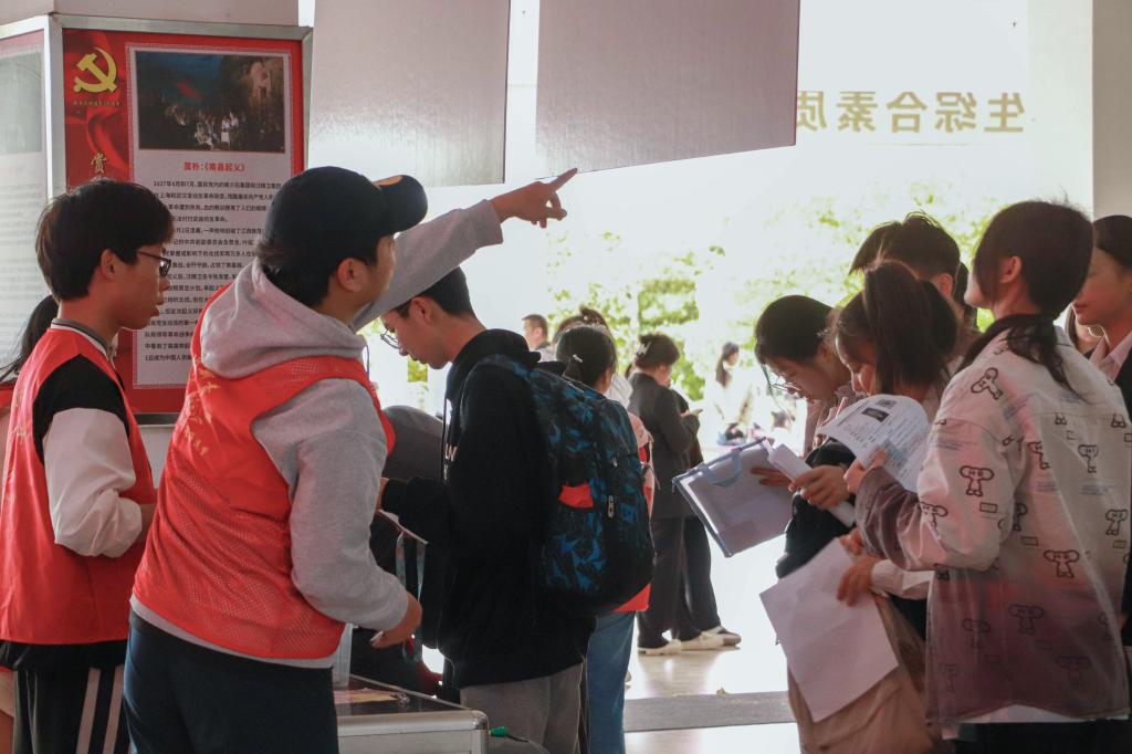 “同学你好,请问你报考的是什么专业?”“同学你好,请问你需要什么帮忙?”在志愿者的悉心引导下,考生有序地完成刷卡验证、寄存物品、安全检查等流程,顺利进入候考区等待考试。志愿者们满腔热情,身着红马甲,穿梭在人群中,引导一批又一批的考生。志愿者们热诚的欢迎每一位考生的到来,忙碌的身影在校园内绘就了一道靓丽的风景线。