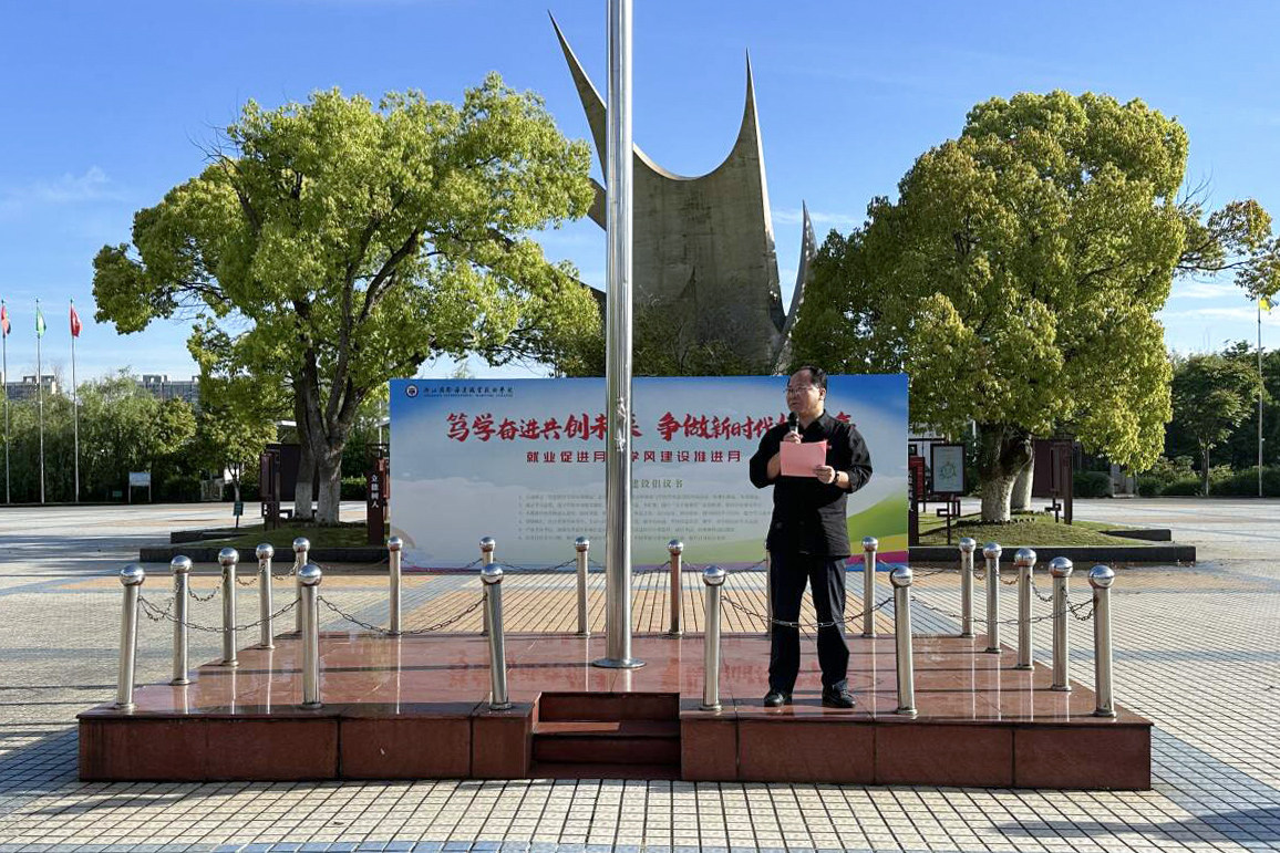 国旗下,孔志光副书记首先传达学习了习近平总书记近日对学校思政课建设作出的重要指示精神,并代表学校党委为启动仪式致辞。他指出,学风建设作为大学文化建设的重要组成部分,是学校的灵魂,是学生的生命,也直接影响到学校的综合竞争力和可持续发展。他强调,全体青年学生要立足长远,切实树立远大理想抱负,时刻保持昂扬向上的朝气,把握好大学学习生活的节奏,努力学好专业技能、参与学校建设,志愿服务地方,为三年后的成才之路打好坚实基础;要加强时间管理,分阶段、有步骤推进学业和职业规划,保持定力、厚积薄发,争取做到“每天坚持不退步,每天争取一点新进步”;要坚持从我做起、从所在班级和寝室做起,主动树立“营造优良学风从我做起”意识,以主人翁的姿态积极参与优良学风、班风、校风建设的各项活动,积极在创建优良学风校风中尽责、受益。