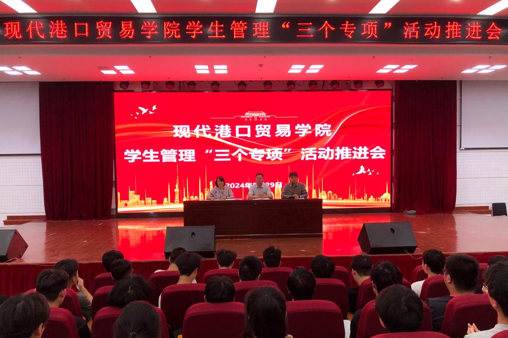 为进一步强化学生管理,营造安全、诚信、文明的校园环境,5月29日,现代港口贸易学院召开学生管理“三个专项”活动推进会。学院党总支书记李刚、综合办主任邵佩华、专业辅导员以及全体在校学生参加会议。会议由学院团委负责人李沛沛主持。