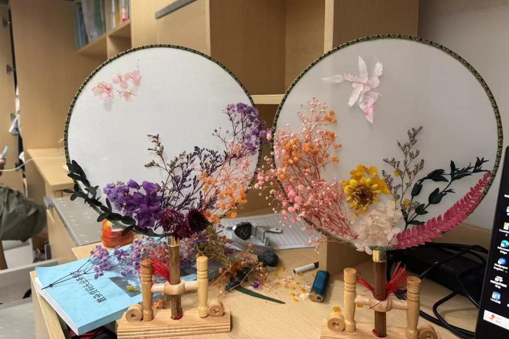 同学们自愿报名,用胶水将各种颜色的花朵标本粘贴在团扇上,包装成礼盒并写了精美的贺卡,亲手制作这份饱含对教师们深情祝福的礼物。