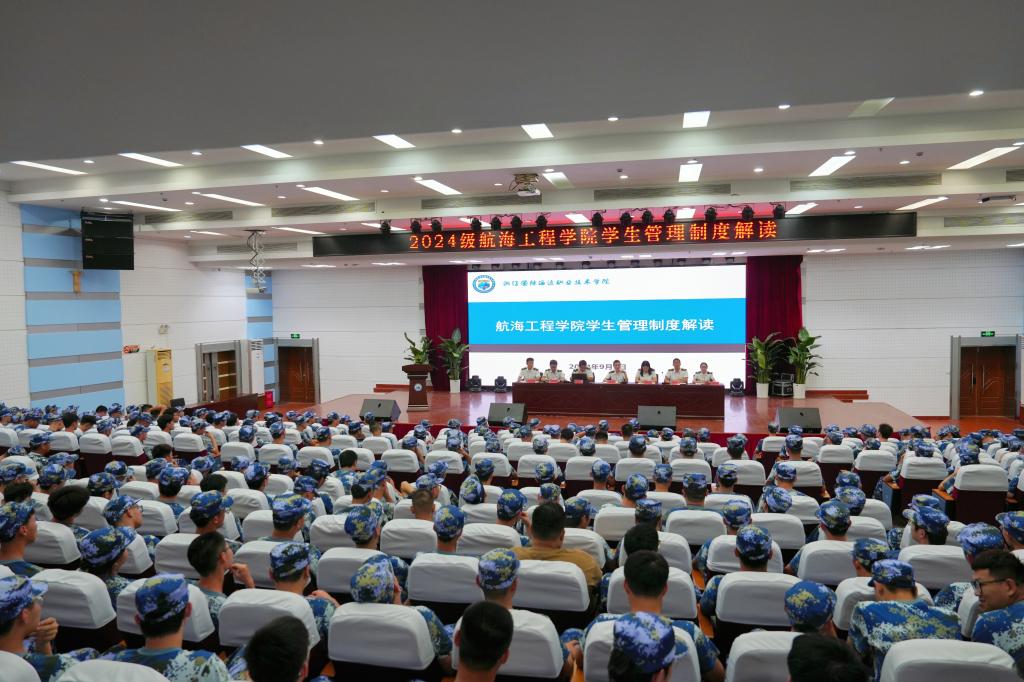 9月9日晚,航海工程学院在图书馆四楼报告厅举行了学生管理制度解读大会。此次大会作为始业教育的重要组成部分,旨在帮助新生全面了解学院各项管理制度,为他们的大学学习生活提供明确指导。学院学工线全体教师和2024级新生参加,党总支副书记李军主持会议。
