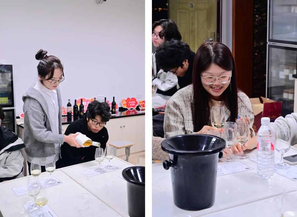随后,跟着线上老师的节奏,同时在孔洁老师的带领下,在场的师生们再一次开启了探索国产葡萄酒密码之旅。考虑到每次品鉴活动都有新人的加入,孔洁老师对葡萄酒品鉴的基础常识进行了简明扼要的讲解,然后带着大家从视觉、嗅觉和味觉三个维度对品鉴进行了实操。七款品鉴用酒各有特色,有的甘冽、有的甜美、有的芬芳、有的则让人回味无穷。同学们也各抒己见,分享着各自的品鉴感受,现场气氛热烈。