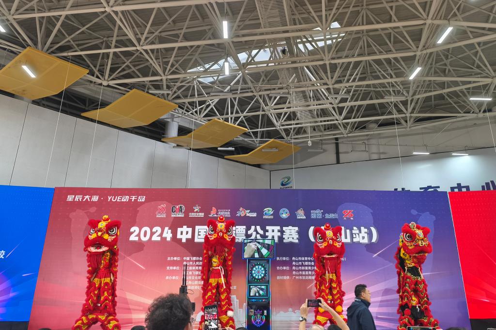 活动现场,观众们热情高涨。龙狮队员身穿色彩鲜艳的传统服饰,手持精致的龙狮道具,精神饱满、气宇轩昂,动作熟练、精准。龙狮伴随着激昂的鼓点起舞,跳跃翻腾,精彩绝伦的表演让飞镖选手们在紧张的比赛氛围中得到了放松和鼓舞。