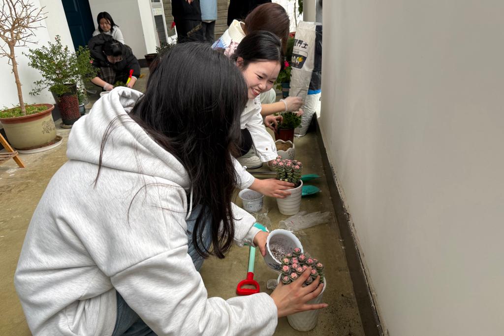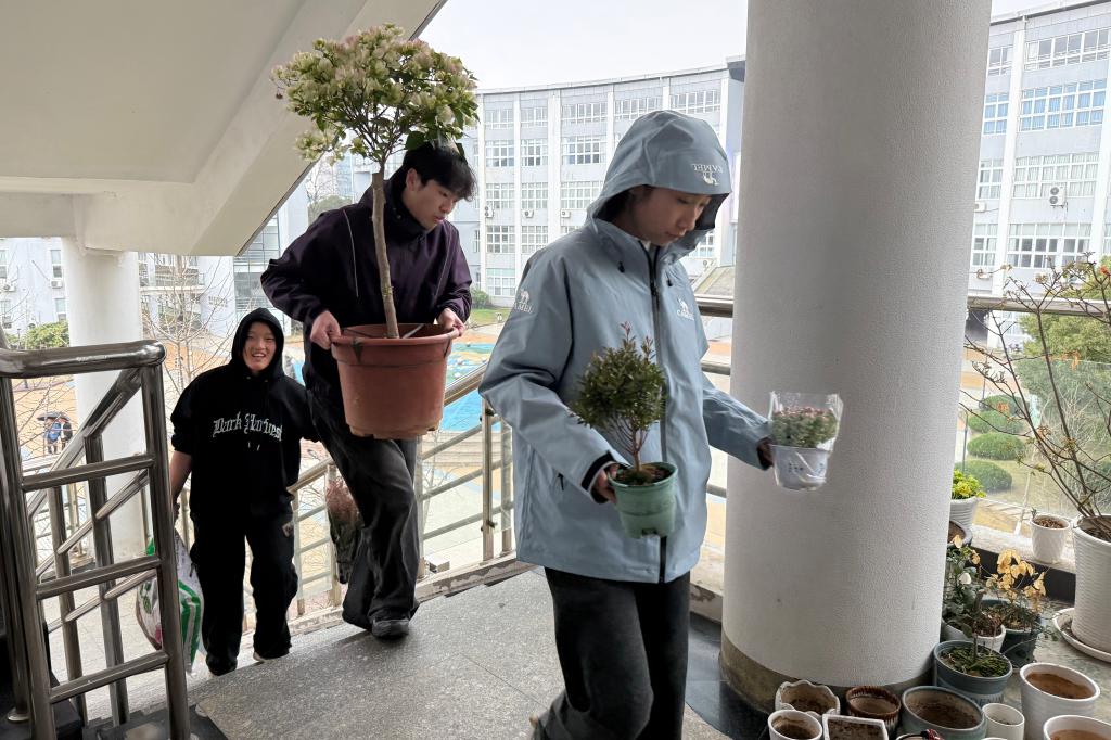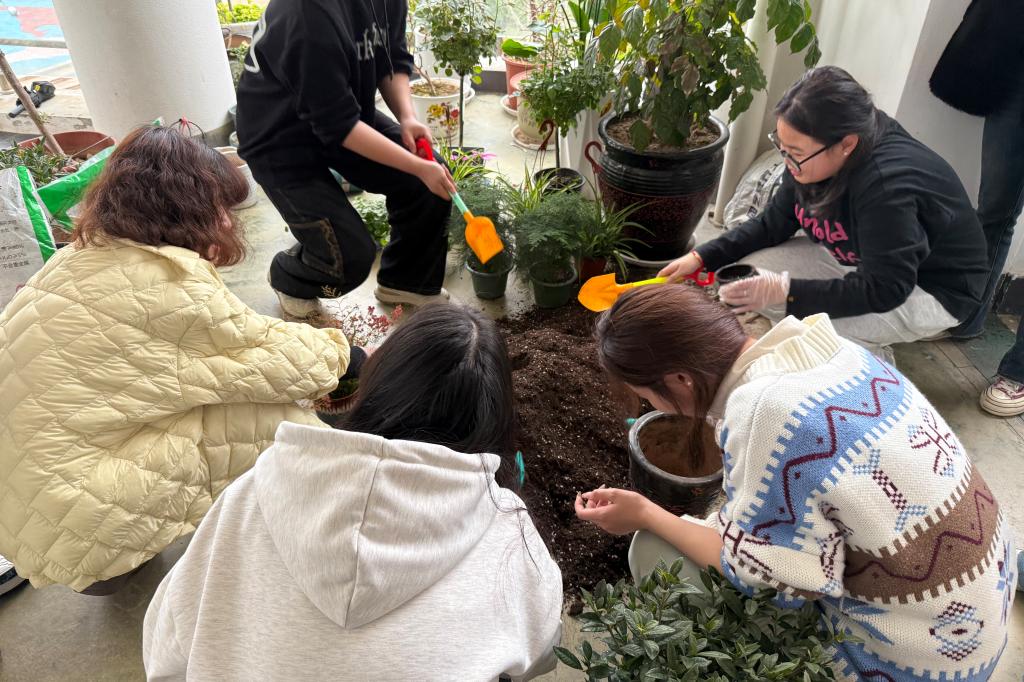 活动现场,师生们热情高涨,早早便来到指定区域,积极领取工具与盆栽。在老师的示范指导下,大家有条不紊地进行植树活动。同学们小心翼翼地将绿植从旧盆中取出,老师则在一旁耐心提醒保护根系的要点。师生们相互协作,有的扶住新盆,有的填土固定,每一个步骤都认真细致,大家一边劳动,一边交流着养护植物的经验,欢笑声与讨论声交织在一起。