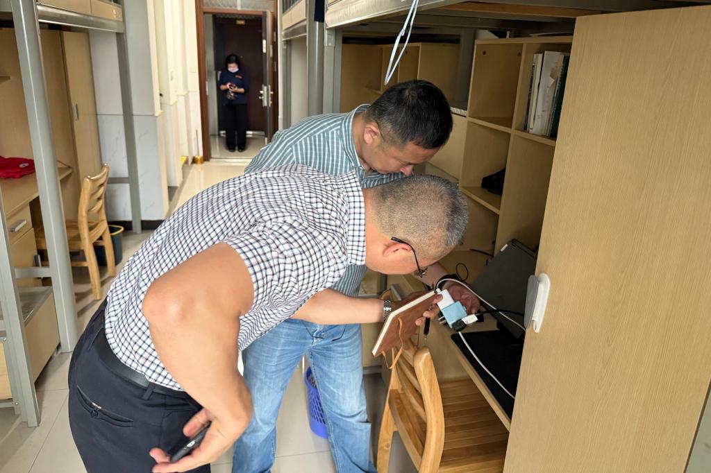 在检查的过程中,检查组认真排查,同时教育引导学生要注意用电安全,树立安全防范意识。同学们积极配合检查,整体情况较好,未发现使用大功率电器,但个别宿舍存在插排使用不当、宿舍卫生较差、寝室内有烟盒等问题,检查组均已在现场督促学生进行整改。
