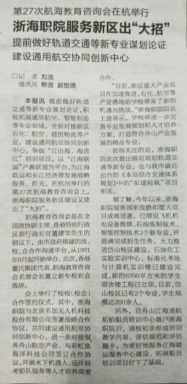 本报讯 提前做好轨道交通等新专业谋划论证,积极扩展通用航空、智能制造等专业领域,全面对接新区石化、航空、港贸物流等产业,建设通用航空协同创新中心,争取“江出海、海进江”培训项目,以“江海联运”产教联盟为平台,为江海联运和长江经济带发展战略服务。昨天,在杭州举行的第27次航海教育咨询会上,浙海职院服务新区建设又使出了“大招”。