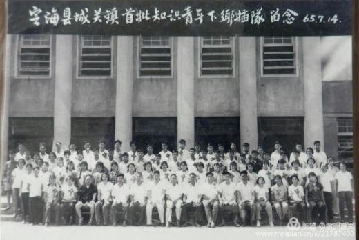 1965年7月14日下午,定海知青安置办在原舟山剧院大门口举行了知青欢送大会,并进行了集体拍照留念。胸前戴着大红花的知青们在一阵阵激情高扬的锣鼓声中,与亲人告别,登上了解放军大卡车,前往紫微公社,开始了新的人生经历。