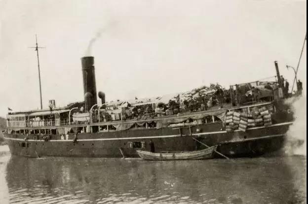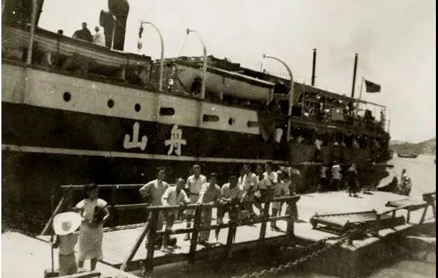 这张民国照片,展示的是即将驶离定海道头的“舟山轮”全景,船上的大烟囱正冒出滚滚浓烟,货物和客人把整艘船塞得满满当当。