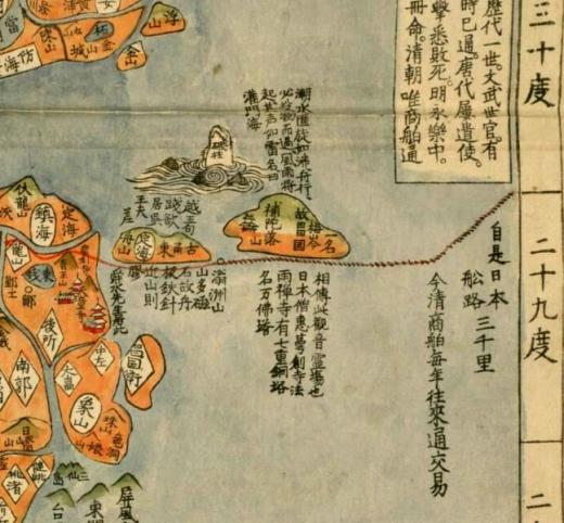 “对舟山群岛来说,这幅地图的最重要之处是一条途经舟山海域的红线条。舟山岛和普陀山岛下面,绘有一条由宁波前往日本的红线,这条红线就是一条东亚‘海上丝绸之路’。在红线的右端,也有一段注解:‘自是日本船路三千里,今清商舶每年往来通交易。 ’”