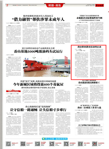 近几年来,我市始终坚持教育优先发展,现代职业教育体系不断完善,结构布局不断忧化,基础能力和内涵水平显著提升。2017年5月,浙海职院岱山校区正式挂牌成立,设立石油化工学院,岱山产学研基地和浙江石油化工有限公司职工培训学院;去年10月,舟山航空培训中心(波音合作机构)落户新区旅游健康学院。深化产教融合有效地提升了我市职业教育的办学质量,更加紧密地服务新区建设和经济社会发展,为“四个舟山”建设提供充足的人力资源和坚实的智力支持