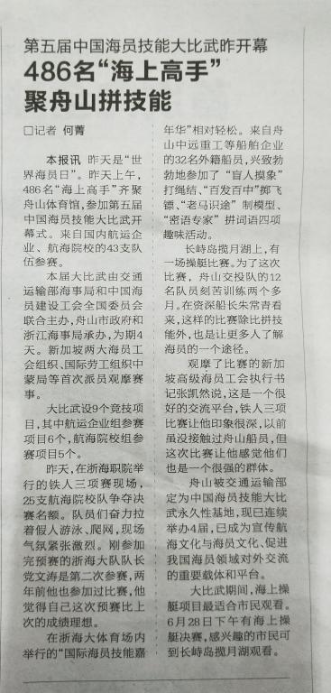 《舟山晚报》:第五届中国海员技能大比武昨开幕 486名航海能手汇集舟山竞技
