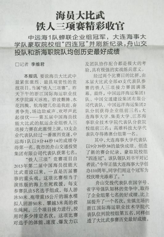 《舟山日报》:海员大比武 铁人三项赛精彩收官