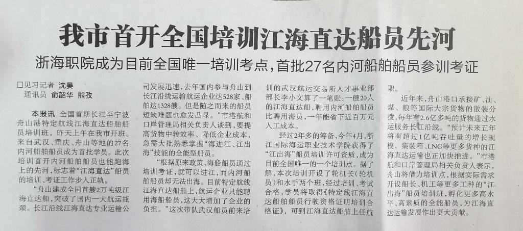 《舟山日报》:我市首开全国培训江海直达船员先河 浙海职院成为目前全国唯一培训考点,首批27名内河船舶船员参训考证