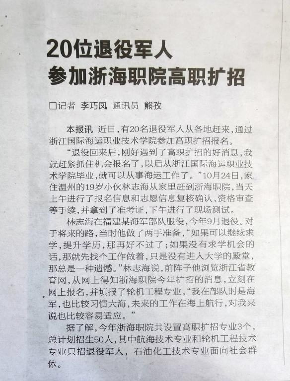 《舟山晚报》:20位退役军人参加浙海职院高职扩招