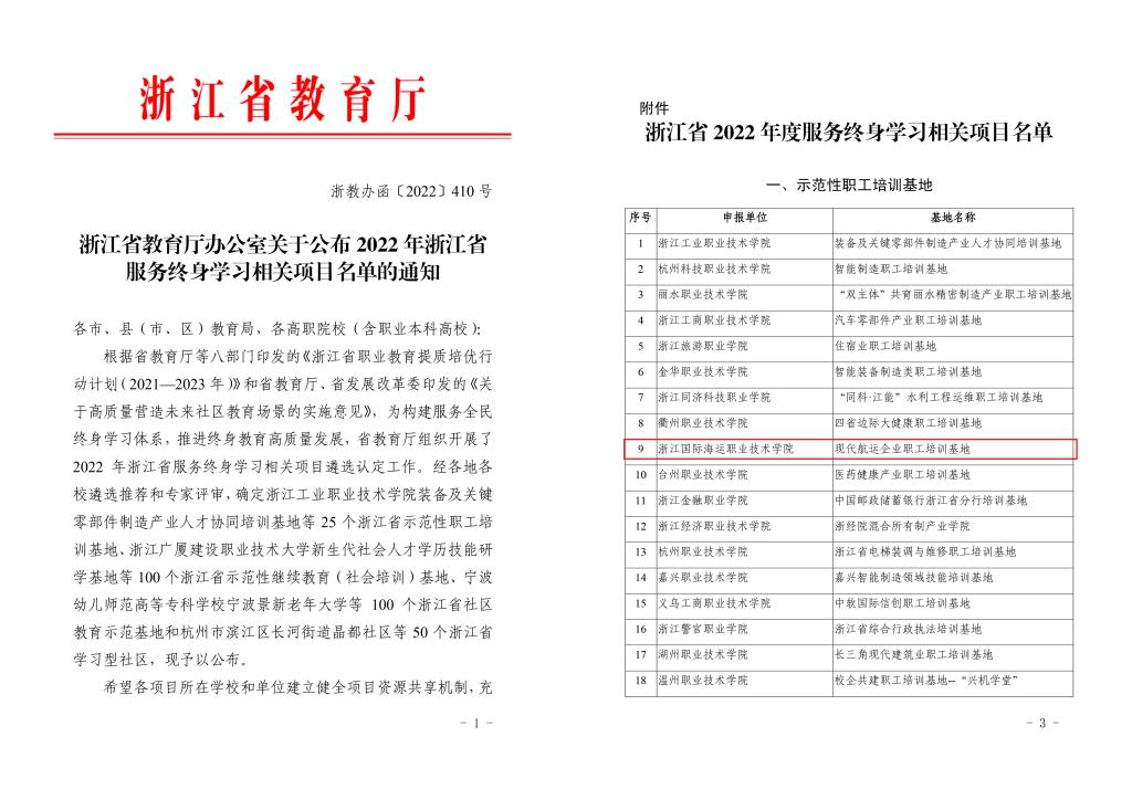 近日,浙江省教育厅发文公布了“浙江省2022年度服务终身学习相关项目名单”,我校申报的“现代航运企业职工培训基地”荣获示范性职工培训基地、“国际海运培训基地”荣获示范性继续教育(社会培训)基地、“舟山市新城校地共建社区教育基地”荣获社区教育示范基地。