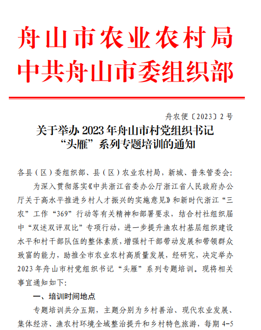 为深入贯彻落实习近平总书记关于“三农”工作重要论述、《中共浙江省委办公厅浙江省人民政府办公厅关于高水平推进乡村人才振兴的实施意见》和新时代浙江“三农”工作“369”行动等有关精神和部署要求,为进一步提升渔农村基层组织建设水平和村干部队伍的整体素质,增强村干部带动发展和带领群众致富的能力,助推全市农业农村高质量发展,2023年2月以来,舟山市乡村振兴学院多次走访舟山市委组织部、市农业农村局等部门,就2023年村党组织书记培训开展专题调研,通过与相关职能处室反复磋商,六易其稿,确定2023年舟山市村党组织书记“头雁”系列专题培训方案。